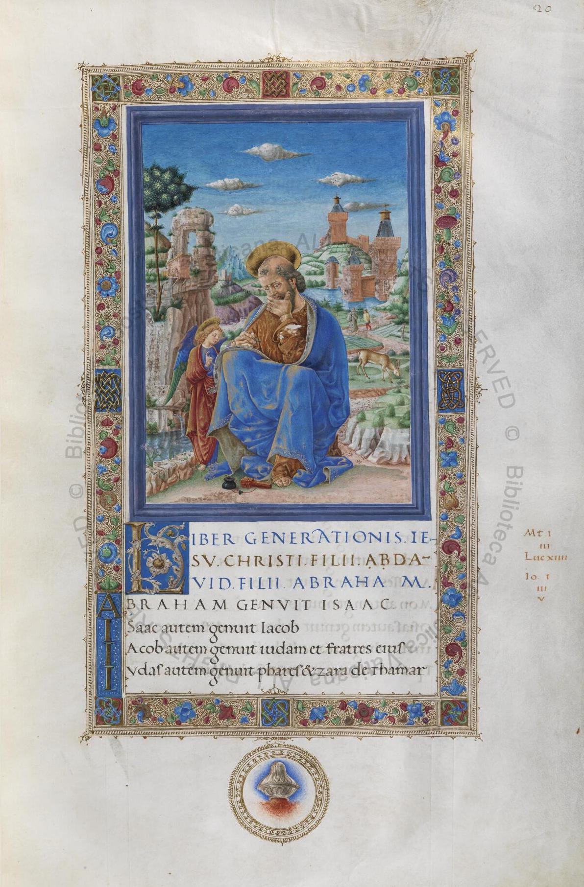 Ms urb lat 10 Evangeliarium van Federigo da Montefeltro, Ferrara/Urbino ca 1474-1482, verluchting door Guglielmo Giraldi: f. 20r evangelist Mattheus, 75r evangelist Marcus en Franco dei Russi: f. 114r evangelist Lucas, 175r evangelist Johannes