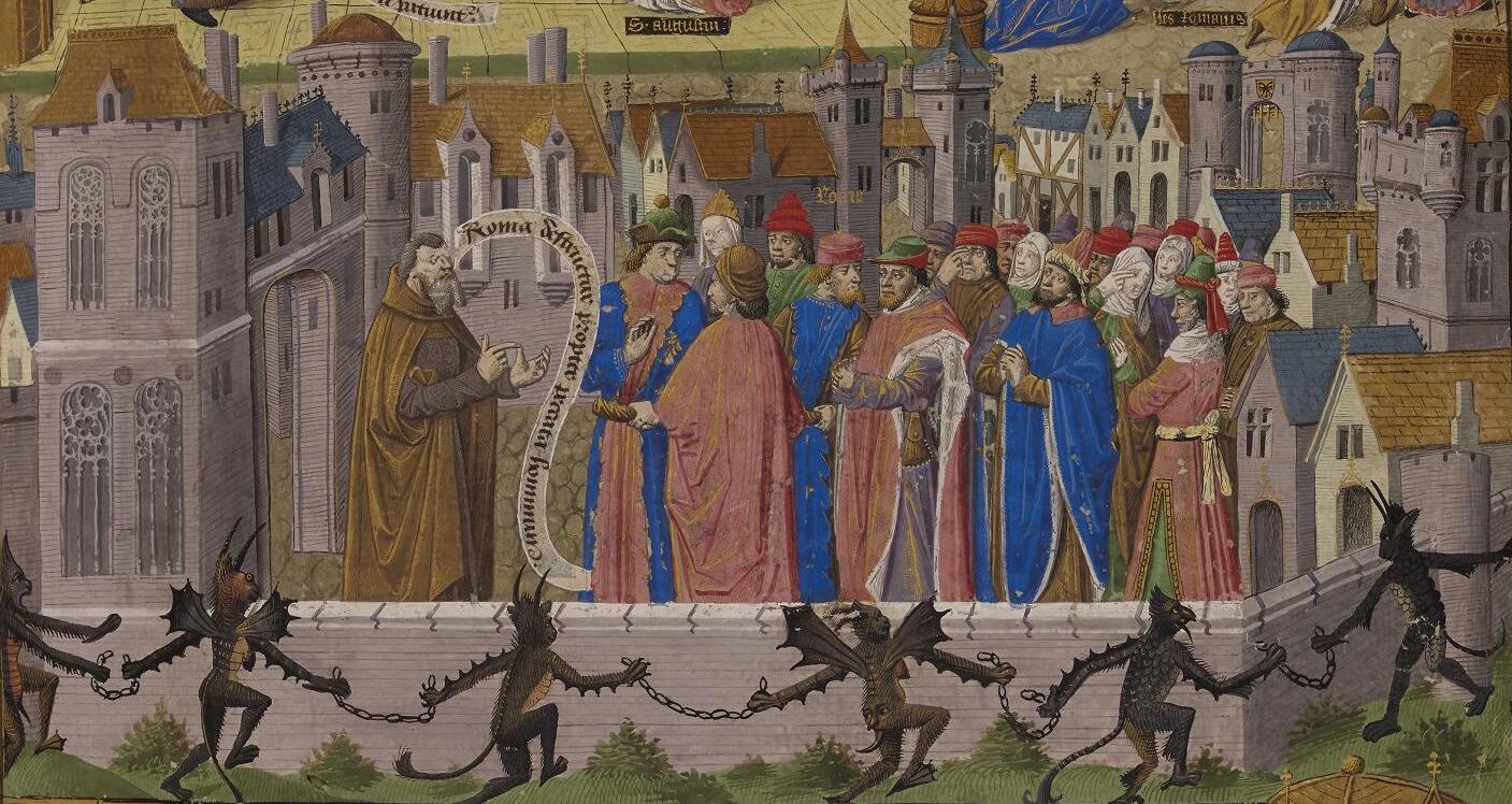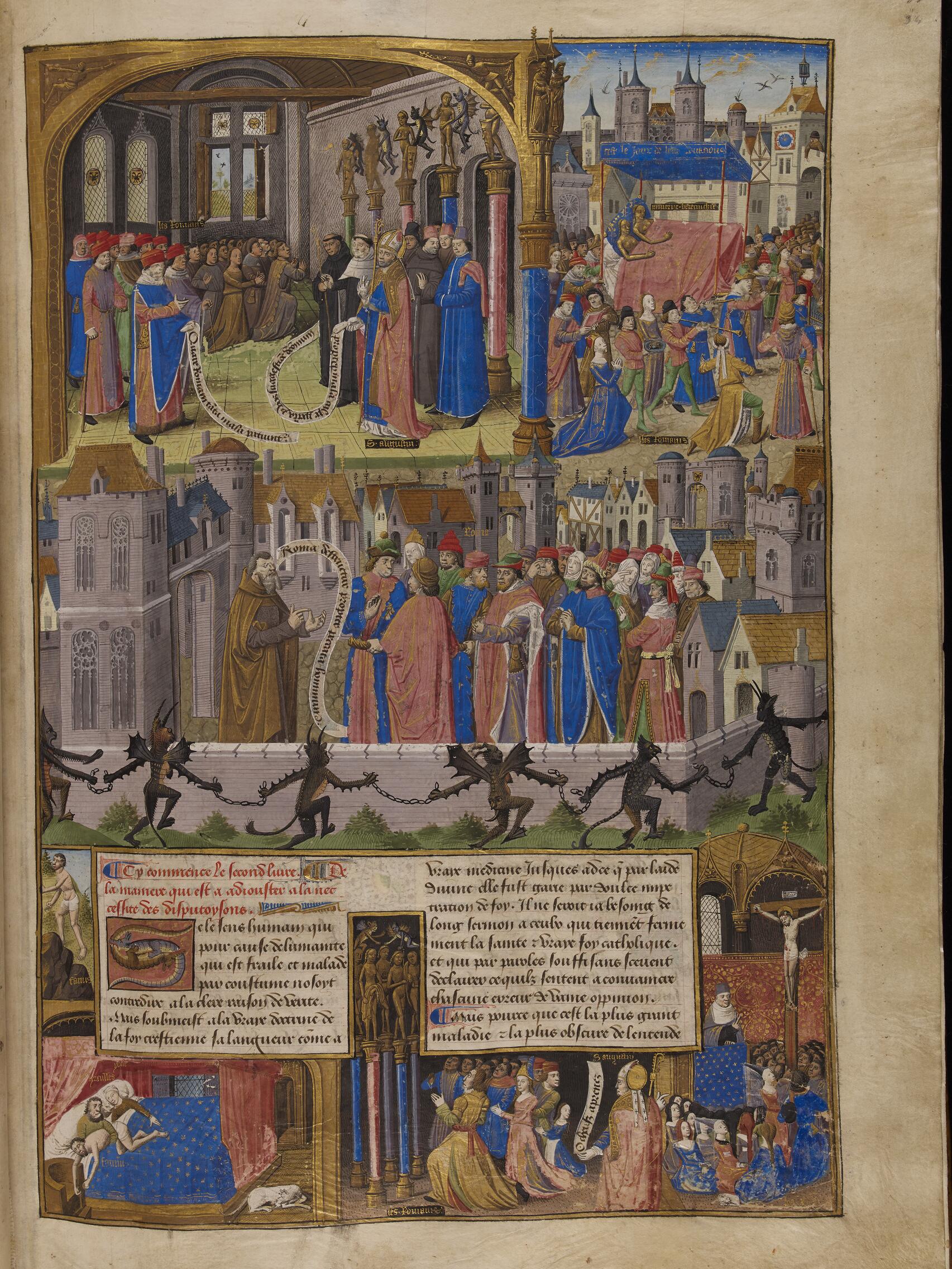 Ms 1 Augustinus, La cité de Dieu (2 vols) ca 1480 Meester van Coëtivy: frontispices van beide delen: f. 2r en 7r); Meester van de Cité de Dieu van Maçon: overige verluchting