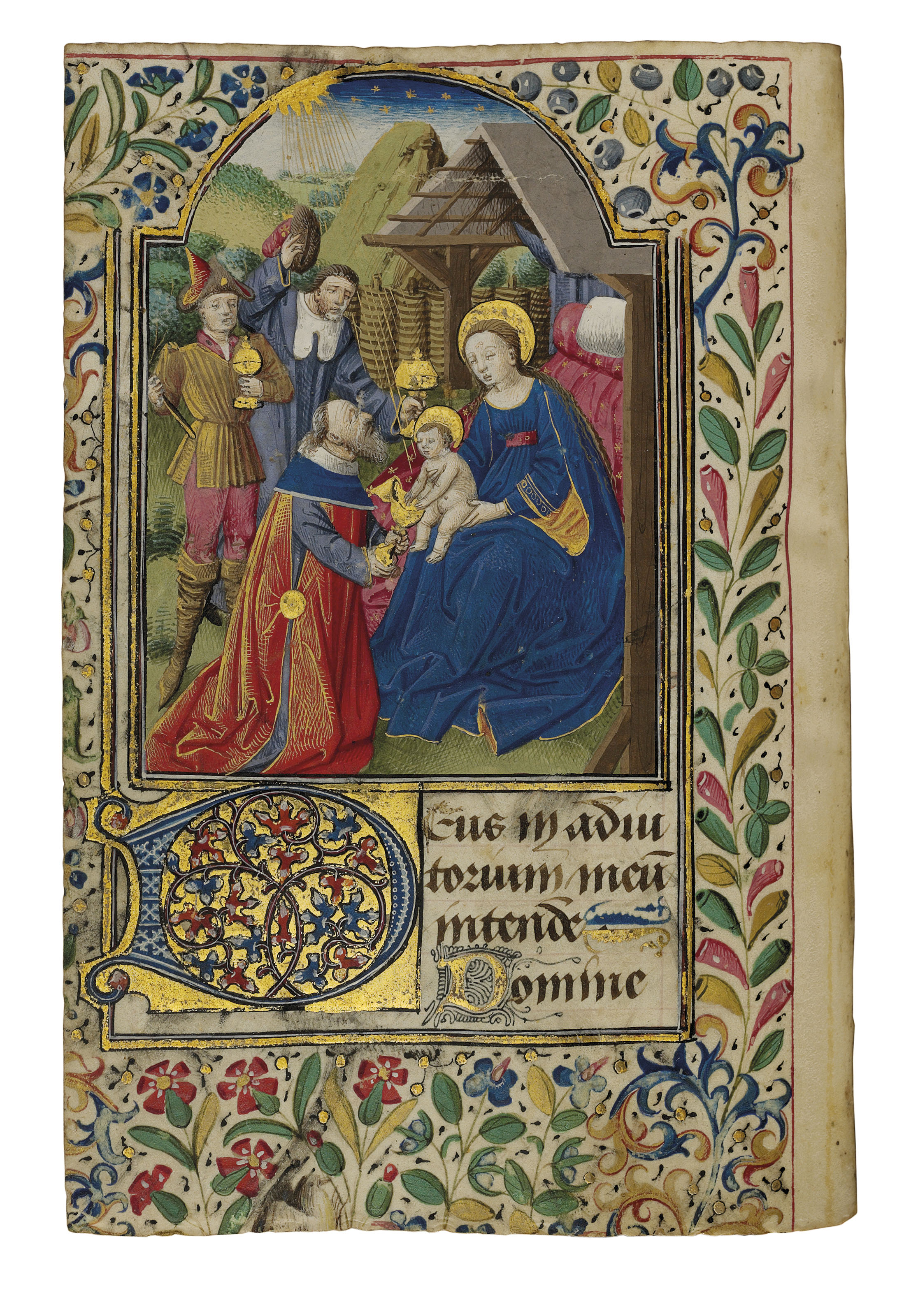 Catalogus 16 juli 2014, lot 14 getijdenboek, bevat de volgende miniaturen: the Evangelists in a quadripartite format f.13; Annunciation f.26; Visitation f.50; Nativity f.61; Adoration of Shepherds f.66v; Adoration of Magi f.71; Presentation in the Temple f.78; Flight into Egypt f.82; Coronation of the Virgin f.88v; David in Prayer f.94; Pentecost f.119; Funeral mass f.125; Holy Trinity f.173v, Parijs, ca 1460
