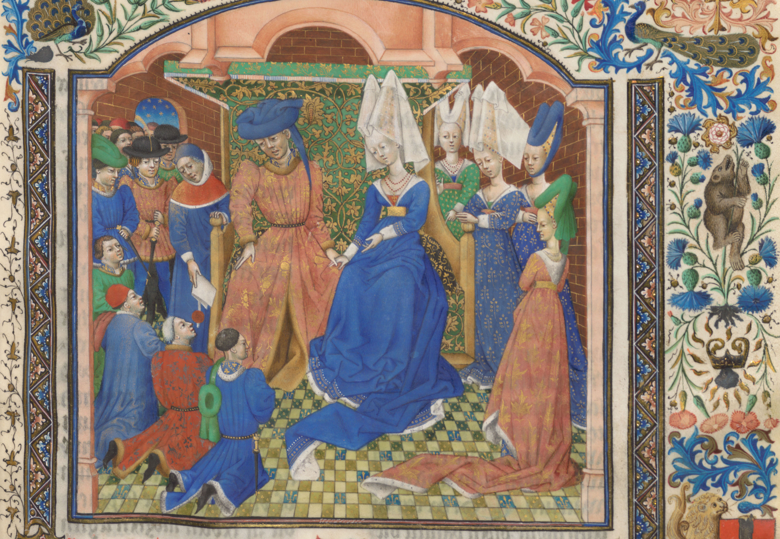 Ms 9016 Augustinus, la cité de Dieu (Franse vertaling door Raoul de Presles), volume II, Brussel en Gent of Tournai, ca 1445, geschreven door Nicolas Cotin voor Jean Chevrot, bisschop van Tournai (Doornik), verluchting door de Meester van de Chevrot-Augustinus: f. 1r: frontispice met aanbieding van het handschrift door Raoul de Presles aan Karel V; Meester van de Privilegiën van Gent en Vlaanderen: overige miniaturen