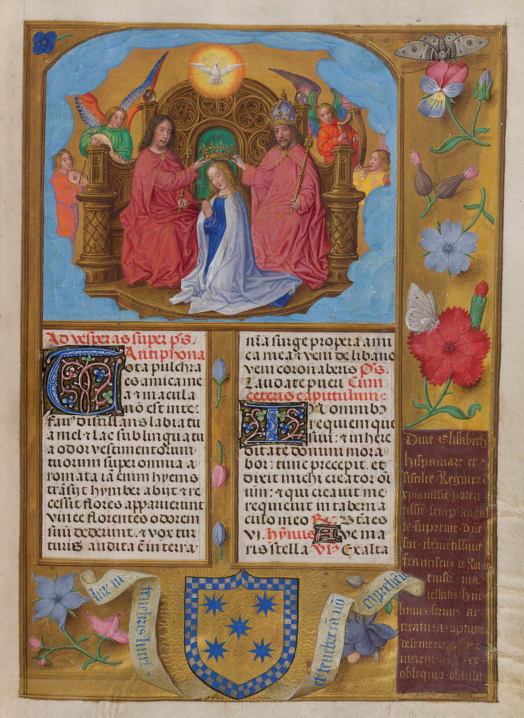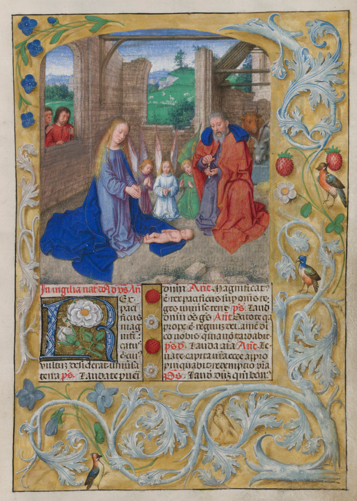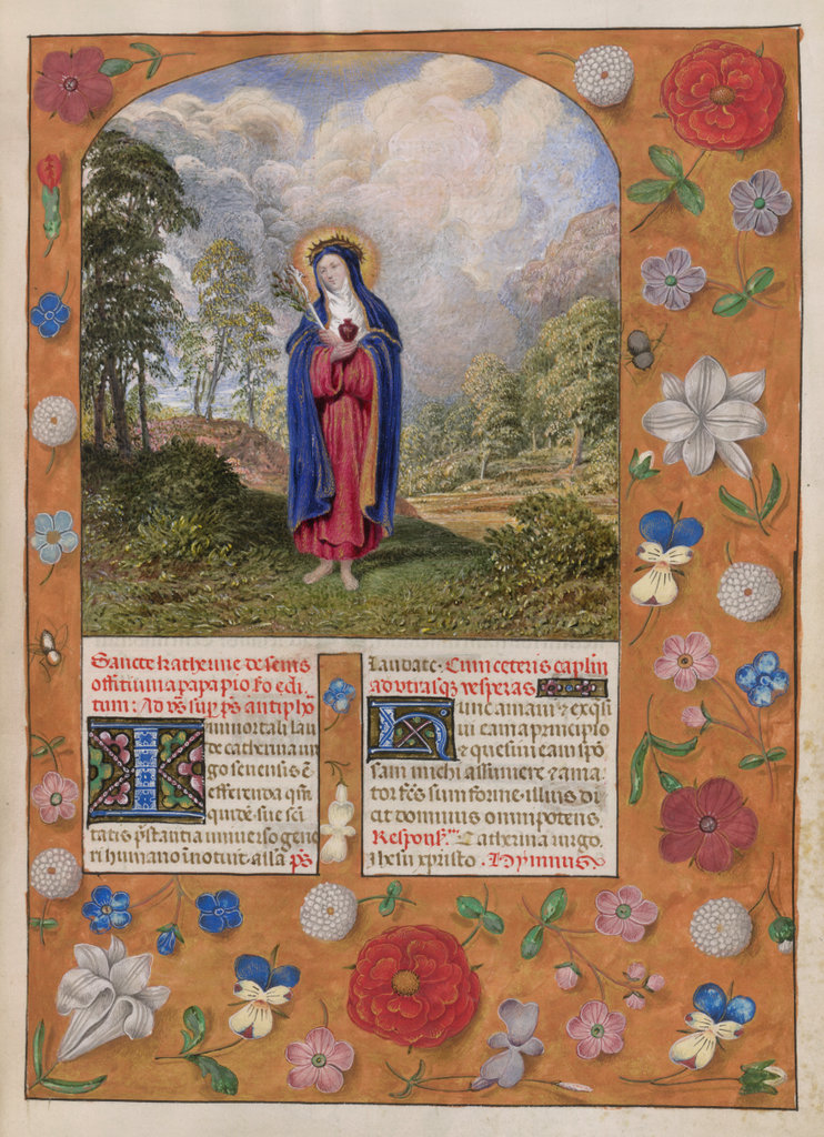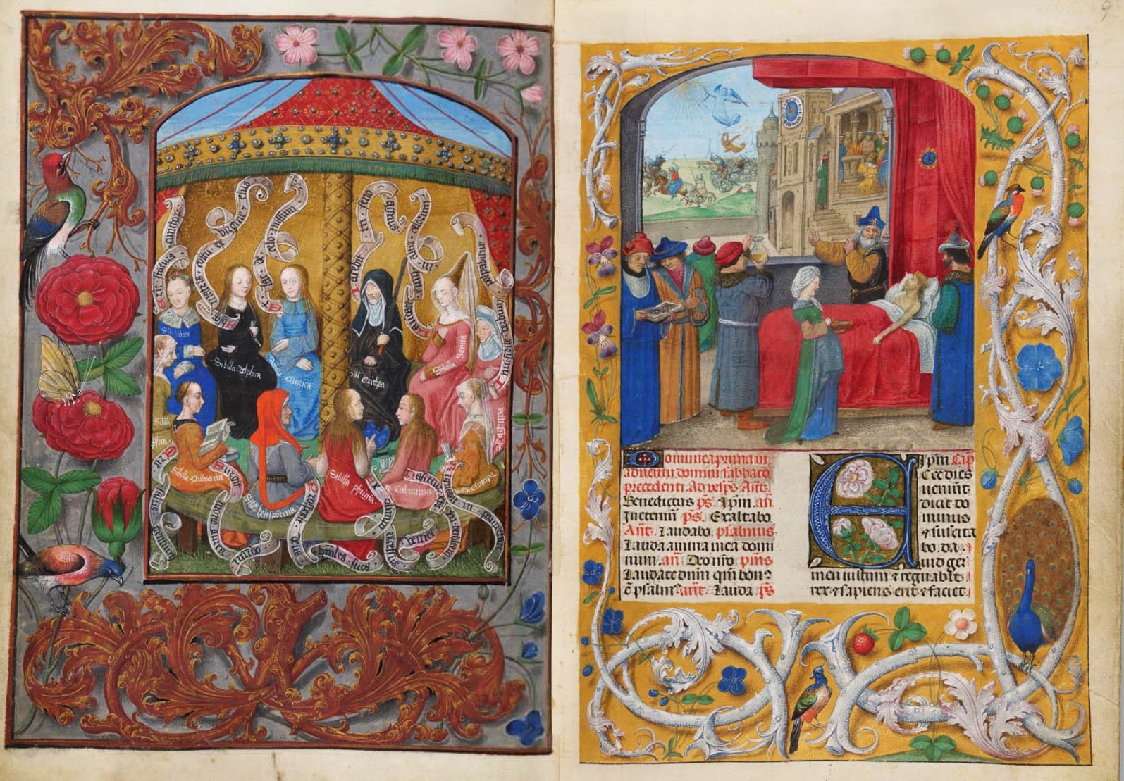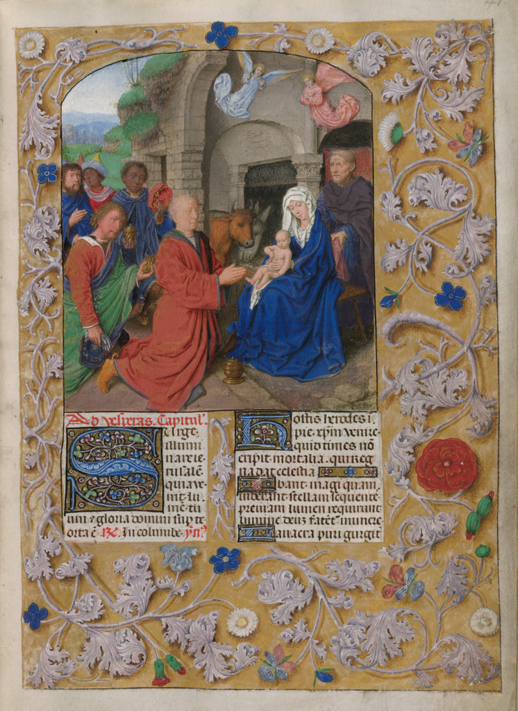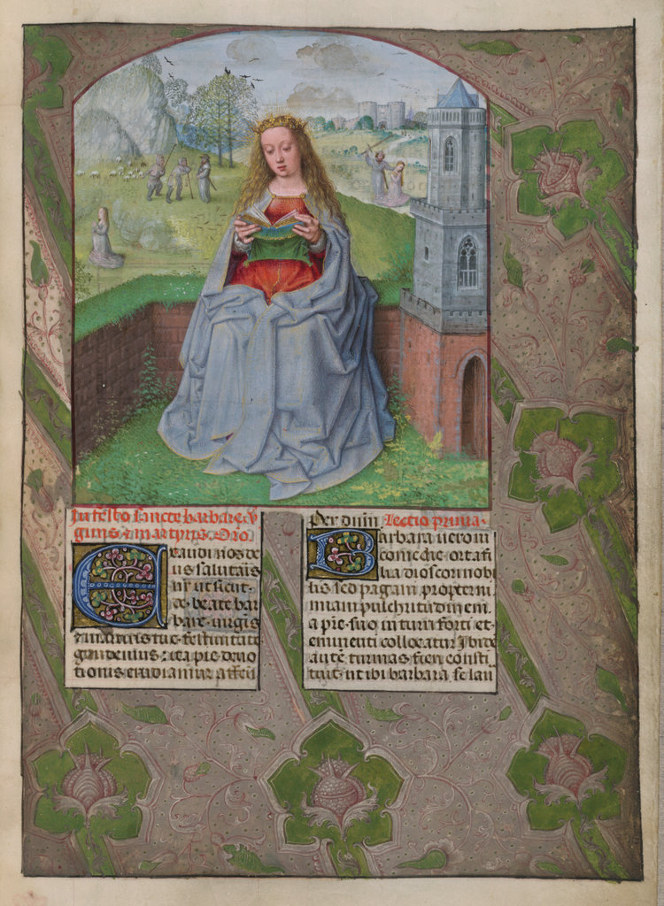 verluchting door Gerard David: f. 29r: geboorte van Christus, f. 41r: aanbidding door de wijzen, f. 297r: St. Barbara; de Meester van het Dresdense Gebedenboek; de Meester van Jacobus IV van Schotland; de Meester van Johannes op Patmos van het Breviarium van Isabella van Castilië; de Meester van de Kalender van het Breviarium van Isabella van Castilië