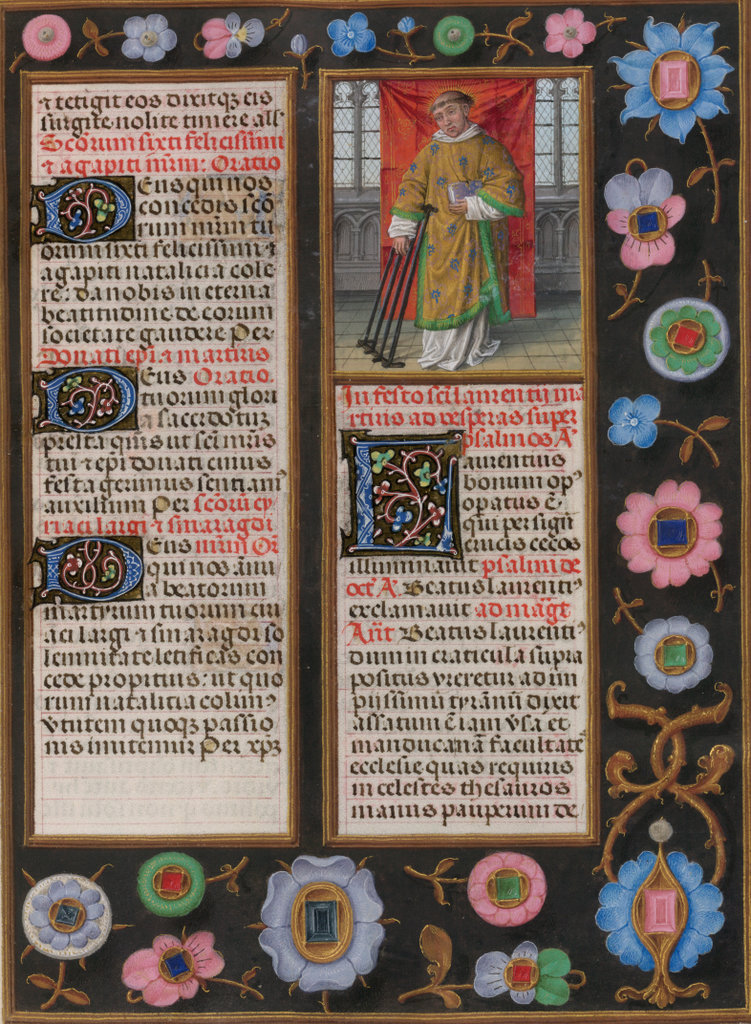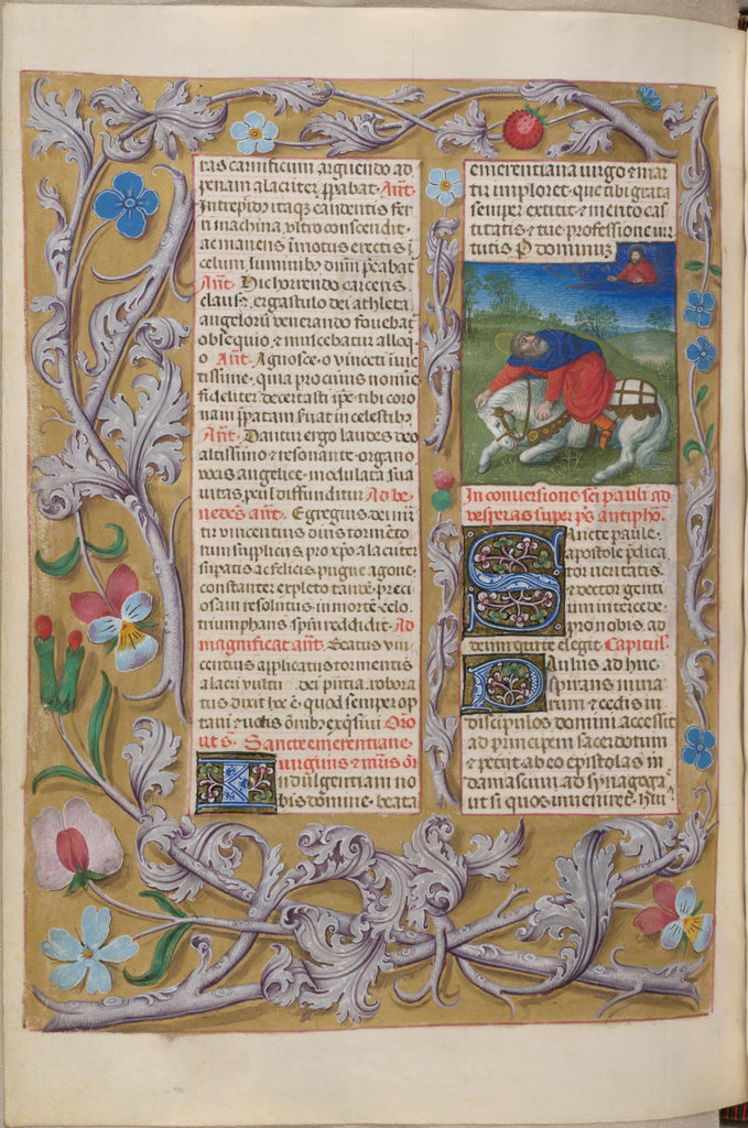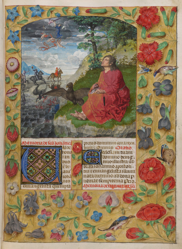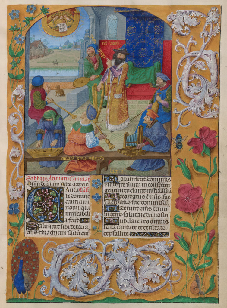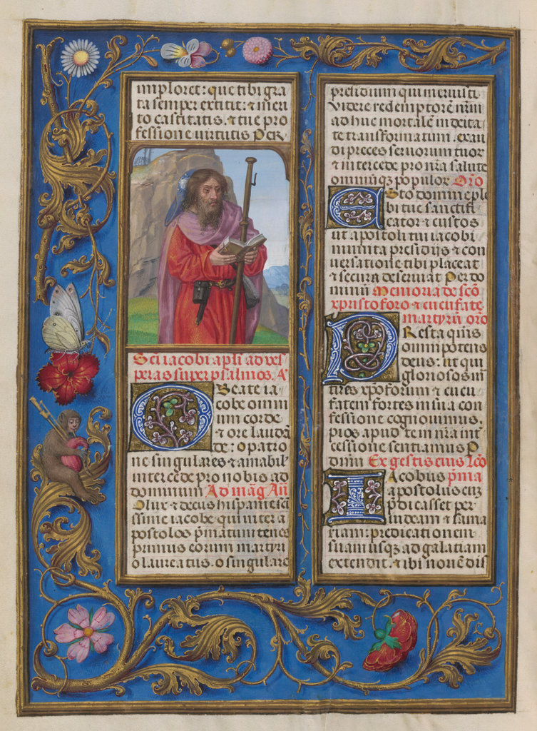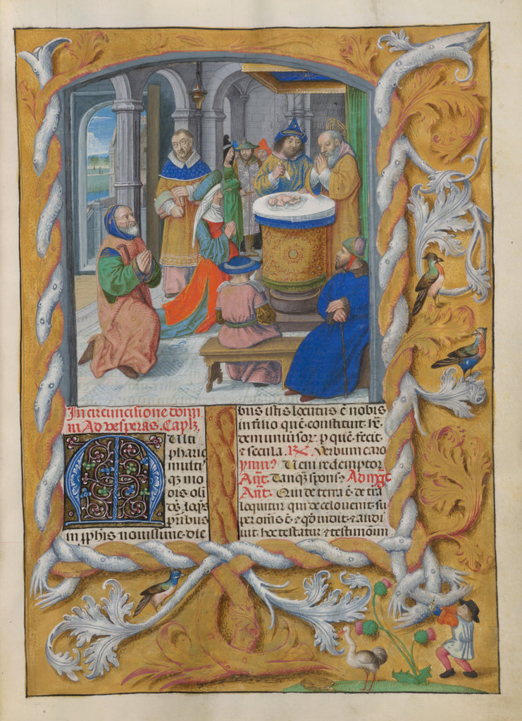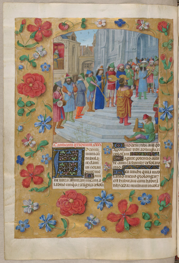 verluchting door Gerard David: f. 29r: geboorte van Christus, f. 41r: aanbidding door de wijzen, f. 297r: St. Barbara; de Meester van het Dresdense Gebedenboek; de Meester van Jacobus IV van Schotland; de Meester van Johannes op Patmos van het Breviarium van Isabella van Castilië; de Meester van de Kalender van het Breviarium van Isabella van Castilië