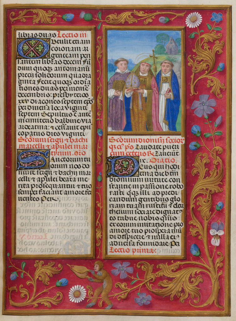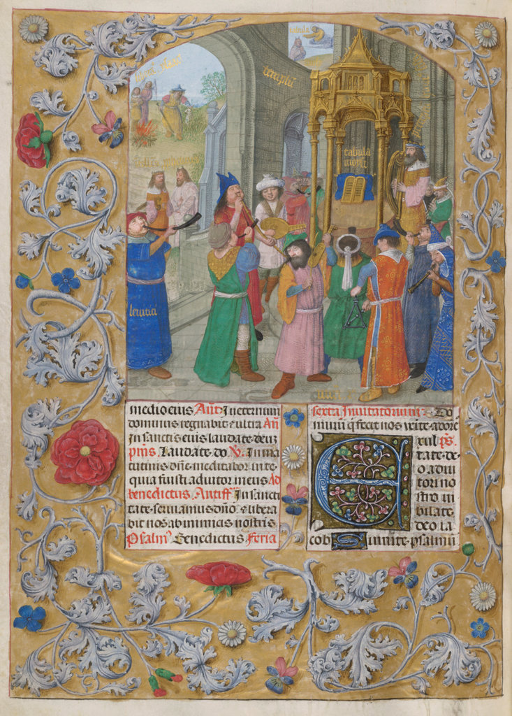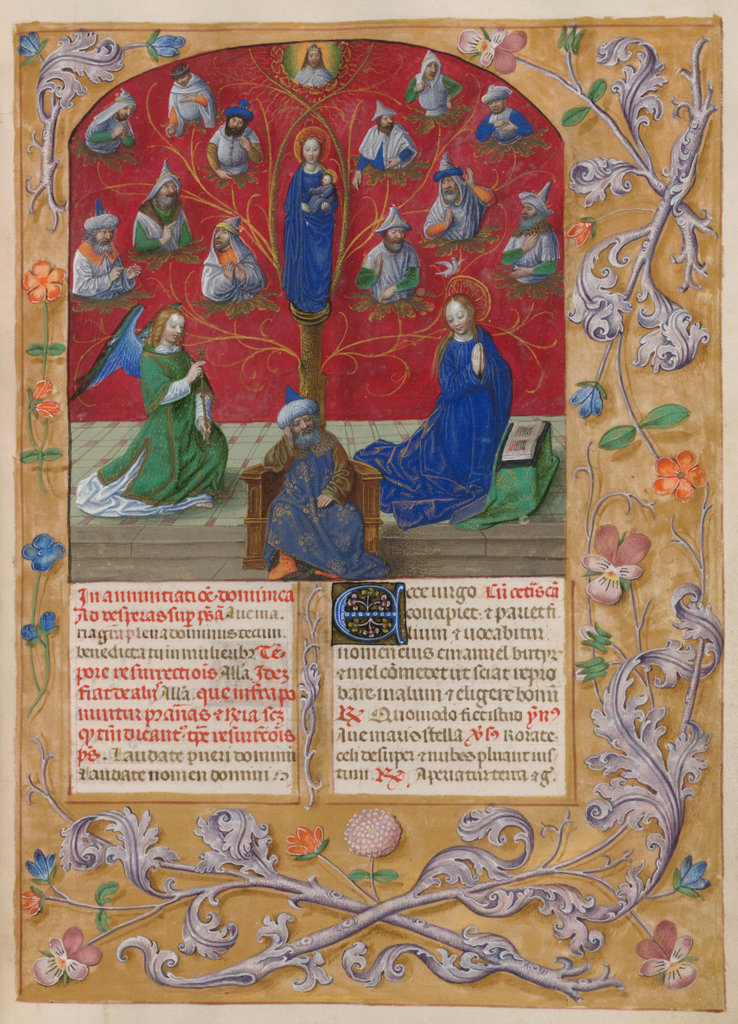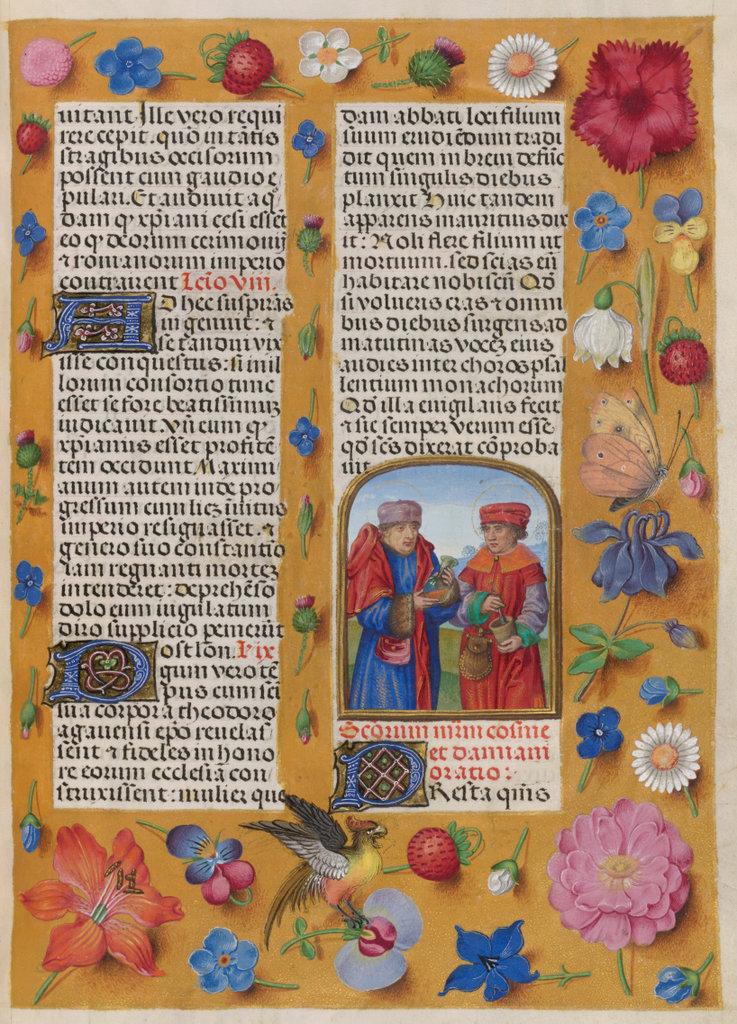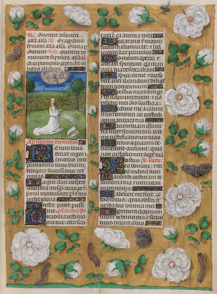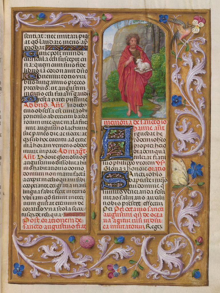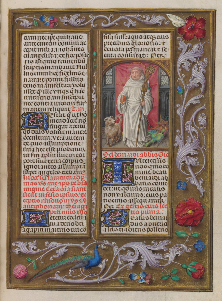verluchting door Gerard David: f. 29r: geboorte van Christus, f. 41r: aanbidding door de wijzen, f. 297r: St. Barbara; de Meester van het Dresdense Gebedenboek; de Meester van Jacobus IV van Schotland; de Meester van Johannes op Patmos van het Breviarium van Isabella van Castilië; de Meester van de Kalender van het Breviarium van Isabella van Castilië
