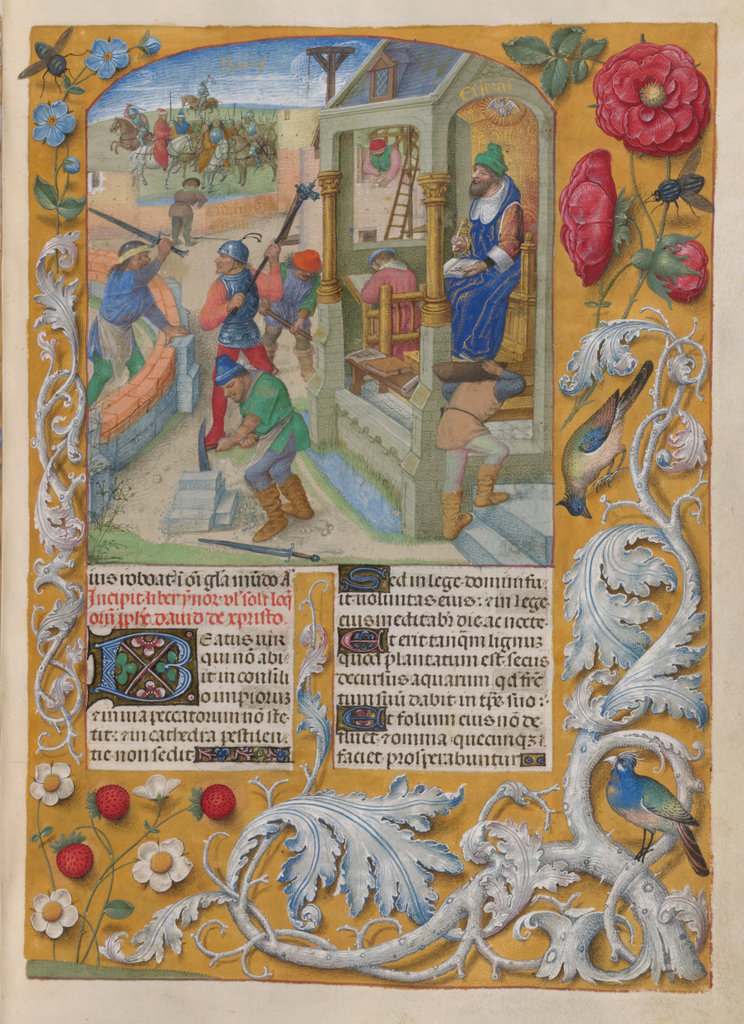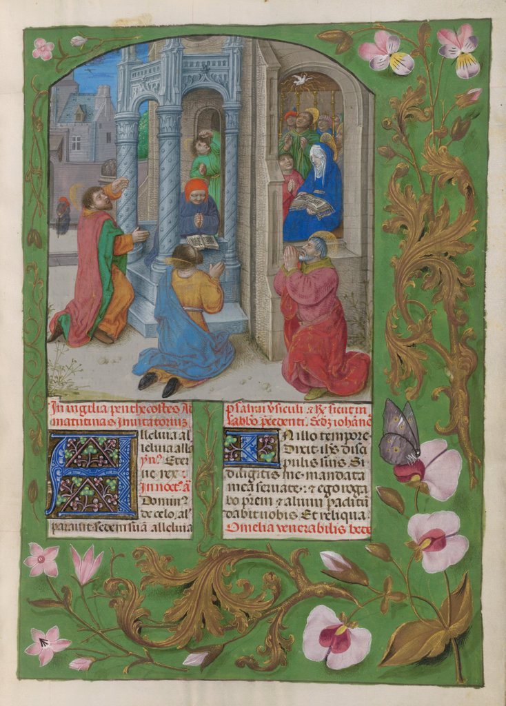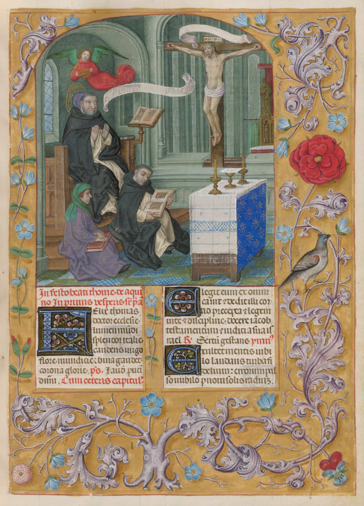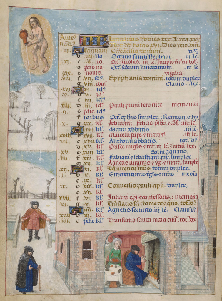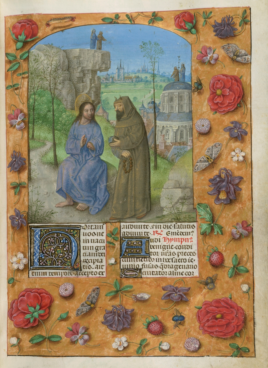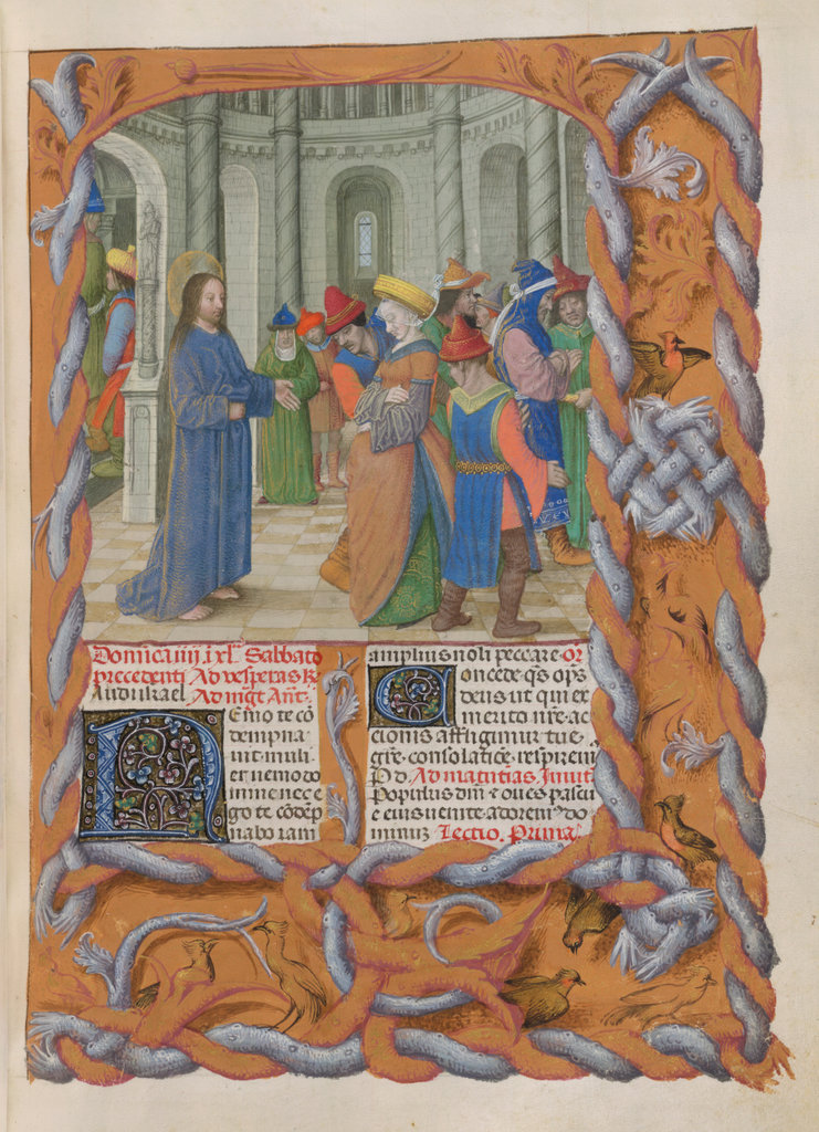 verluchting door Gerard David: f. 29r: geboorte van Christus, f. 41r: aanbidding door de wijzen, f. 297r: St. Barbara; de Meester van het Dresdense Gebedenboek; de Meester van Jacobus IV van Schotland; de Meester van Johannes op Patmos van het Breviarium van Isabella van Castilië; de Meester van de Kalender van het Breviarium van Isabella van Castilië
